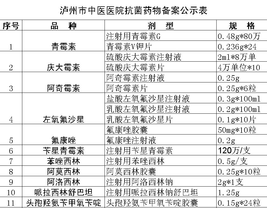 瀘州市中醫(yī)醫(yī)院抗菌藥物備案公示表