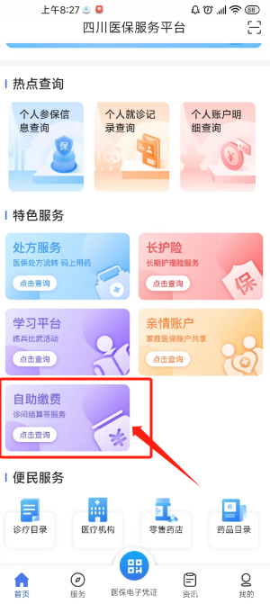 第一步打開APP,登錄后首頁下拉至特色服務(wù)【自助繳費(fèi)】。
