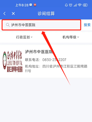 第二步在輸入醫(yī)院名稱搜索欄輸入“瀘州市中醫(yī)醫(yī)院”,點(diǎn)擊醫(yī)院名稱