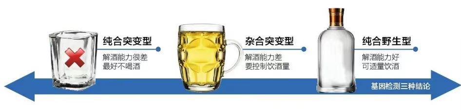 人體的ALDH2主要分三種類型,即純合野生型(ALDH2*1*1)、雜合突變型和純合突變型(ALDH2*1*2)(ALDH2*2*2),分別代表三種酒精代謝能力的強弱,也就是解酒能力的強弱,每個人只會有一種類型為陽性。