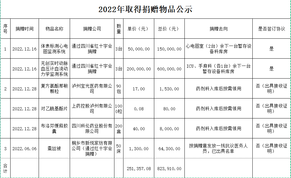 我院自城南院區(qū)開(kāi)業(yè)以來(lái),陸續(xù)接受到來(lái)自紅十字會(huì)以及社會(huì)各界熱心人士的捐贈(zèng)物資、設(shè)備,截止2022年12月31日止,我們共收到捐贈(zèng)物資、設(shè)備共計(jì)3筆,接受捐贈(zèng)的情況和受贈(zèng)受助財(cái)產(chǎn)的使用管理情況公示如下:2022年取得捐贈(zèng)物品公示序號(hào)捐贈(zèng)時(shí)間物品名稱捐贈(zèng)公司數(shù)量單價(jià)(元)總價(jià)(元)捐贈(zèng)去向是否簽訂協(xié)議1...