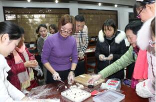 內(nèi)五科醫(yī)護(hù)人員與病友一起完成手工牛軋?zhí)侵谱?/span>