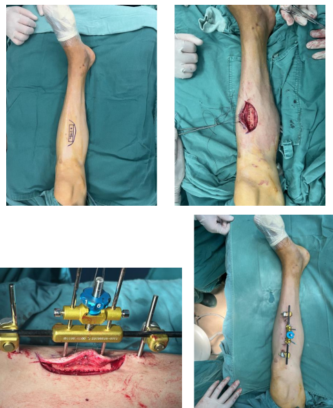 今年7月,由骨傷一科主任汪永泉帶領(lǐng)手術(shù)團(tuán)隊(duì),為患者實(shí)施了左側(cè)脛骨橫向骨搬移術(shù)。術(shù)中,在其左側(cè)小腿脛骨內(nèi)側(cè)進(jìn)行截骨,置入4個(gè)針道,安裝外固定架,手術(shù)歷時(shí)1小時(shí)左右順利完成。經(jīng)過耐心指導(dǎo)外架調(diào)整,患者帶著外固定架回家去休養(yǎng)。
