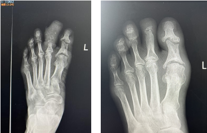 今年5月,趙阿姨在地里栽紅苕時(shí),左腳第二足趾被鞋子磨破,起了個(gè)水泡,并逐漸發(fā)生腫脹、潰爛,在當(dāng)?shù)刂委熞粋€(gè)多月不見起色,后隨著感染加重,第二腳趾已腫脹如大腳趾一般大小,甚至長度更甚,腳趾皮膚、肌肉、骨骼均出現(xiàn)了發(fā)黑、化膿、糜爛,導(dǎo)致下肢站立疼痛,行走時(shí)步態(tài)跛行。