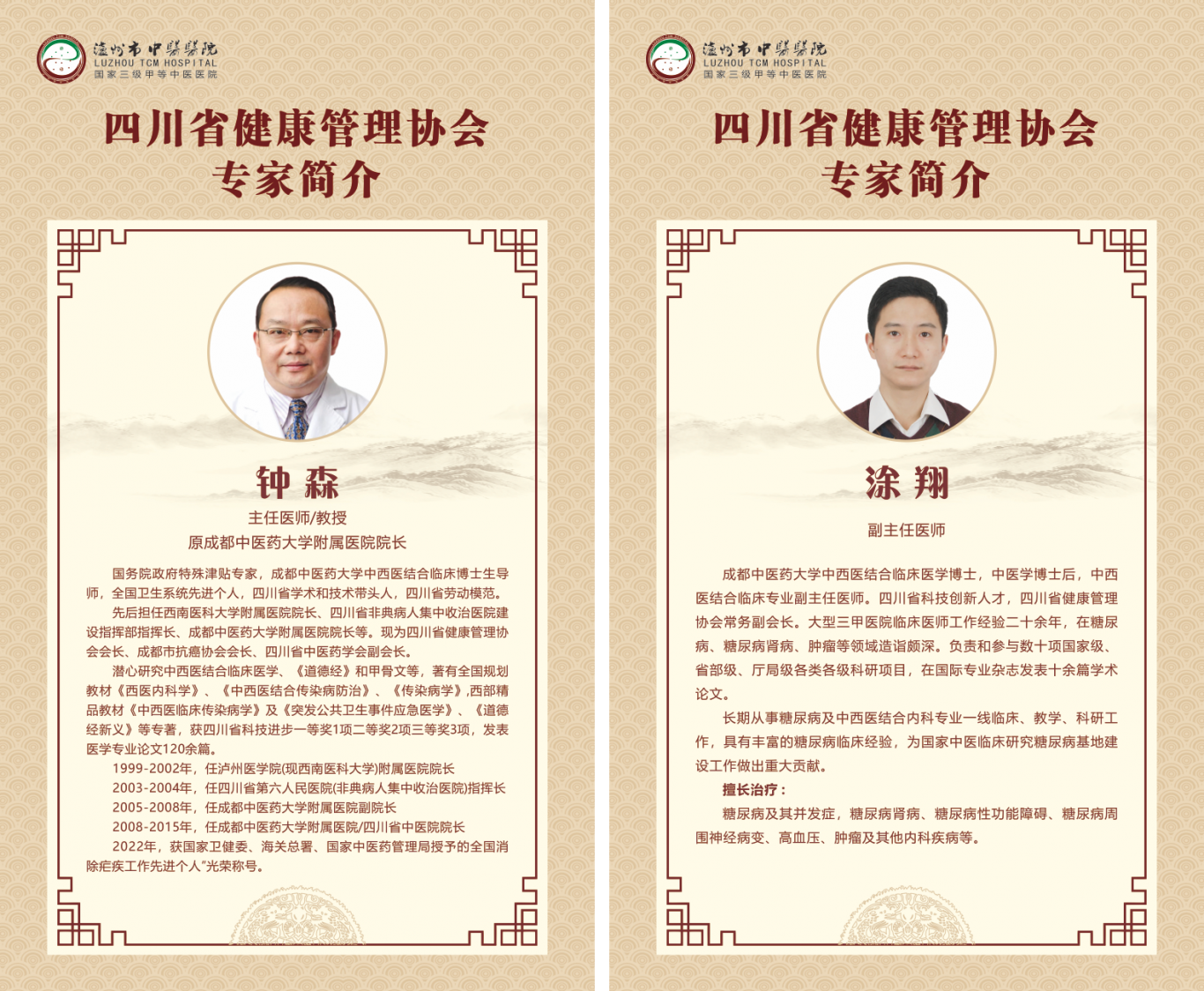 四川省健康管理協(xié)會的兩位資深專家即將來到瀘州市中醫(yī)醫(yī)院坐診。本次坐診活動主要目的是:真正方便群眾,家門口也能看國家級名醫(yī)!兩位專家分別是鐘森和涂翔。