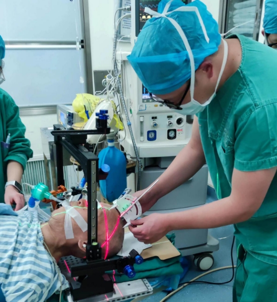 在征得家屬同意后,市中醫(yī)院神經(jīng)外科團(tuán)隊(duì)在謝勇主任的帶領(lǐng)下,經(jīng)過詳細(xì)分析,決定采用“激光精準(zhǔn)定位顱內(nèi)血腫穿刺抽吸外引流術(shù)”的微創(chuàng)手術(shù)方式來解決辜先生的問題。