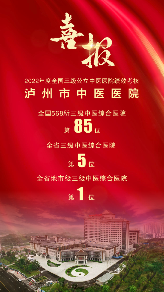 2022年度全國三級公立中醫(yī)醫(yī)院績效考核,在全國三級中醫(yī)綜合醫(yī)院中排名第85位,在全省地市級三級公立中醫(yī)院中排名第1位,瀘州市中醫(yī)醫(yī)院首次實(shí)現(xiàn)從B+到A的飛躍。