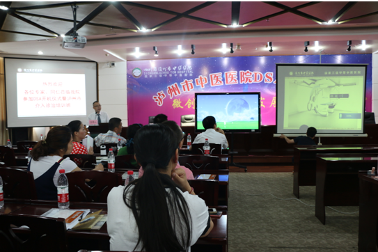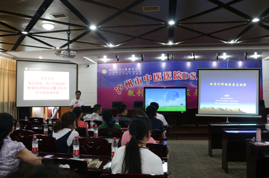 ??? 培訓班以我院放射科副主任劉成平詳細介紹醫(yī)院DSA機的性能及醫(yī)院運用DSA開展的微創(chuàng)介入手術(shù)項目開始。隨后重慶醫(yī)科大學附屬第一醫(yī)院成軍教授結(jié)合PPT圖像及視頻生動形象、深入淺出的講解了《DSA在血管外科中的應(yīng)用》;四川大學華西醫(yī)院王勉教授以《冠心病的介入診治》為主題講解了冠心病的介入診治理論知識,并與我院心血管內(nèi)科袁小蓉醫(yī)師分別就冠狀動脈支架植入術(shù)、冠狀動脈造影術(shù)進行了現(xiàn)場同步直播手術(shù)示教。