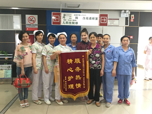 ??? 近日,兩面寫著“崇高醫(yī)德 妙手仁心”、“服務(wù)熱情 精心護(hù)理”的錦旗送到了我院內(nèi)二科醫(yī)護(hù)人員的手中,這是一位83歲高齡,長期臥床的腦梗患者家屬為感謝醫(yī)生精湛的醫(yī)術(shù)及護(hù)理人員的悉心護(hù)理而送給他們的禮物。????? 患者家屬與黃遠(yuǎn)瓊(右二)及內(nèi)二科主任仇燚(左二)等醫(yī)務(wù)人員合影????因病結(jié)緣 主...