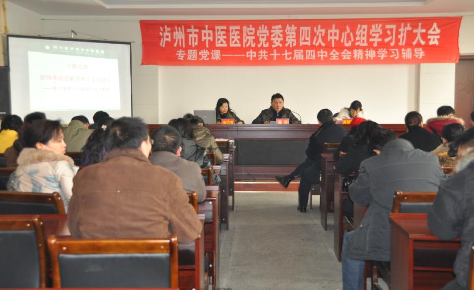 ?瀘州市中醫(yī)醫(yī)院切實加強黨建工作????二〇〇九年十二月二十四日,市中醫(yī)醫(yī)院在市衛(wèi)生局六樓召開了2009年第四次中心組學(xué)習(xí)(擴大)會議,會議由醫(yī)院黨委書記、院長吳濱主持,黨委委員、全院黨員、入黨積極分子和團委骨干參加了學(xué)習(xí)。會議內(nèi)容以學(xué)習(xí)十七屆四中全會精神為主線,吳濱書記對醫(yī)院2009年黨建工作的成...