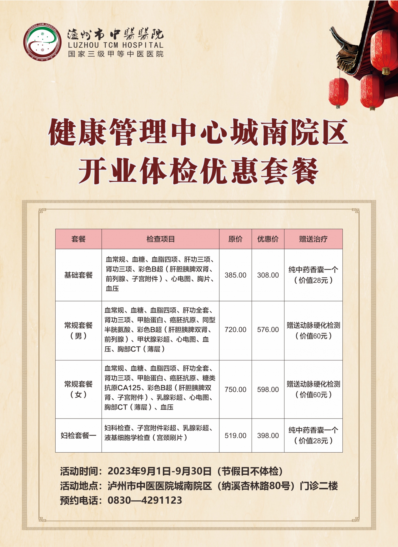 瀘州市中醫(yī)醫(yī)院(城南院區(qū))體檢中心全新開診啦!先進(jìn)的設(shè)備,不同規(guī)格的優(yōu)惠套餐來看看有沒有適合您的瀘州市中醫(yī)醫(yī)院體檢中心擁有先進(jìn)的醫(yī)療設(shè)備,包括高級影像設(shè)備、實(shí)驗(yàn)室分析儀器等,能夠進(jìn)行全面的體檢項(xiàng)目,幫助您了解自身的健康狀況。我們的醫(yī)護(hù)團(tuán)隊(duì)經(jīng)驗(yàn)豐富,專業(yè)的技術(shù)和溫暖的服務(wù)將讓您感到賓至如歸。為此,向大...